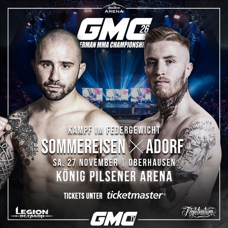 Nachdem mit Michael Smolik gegen Alexander Wesner ein Highlight in der König-Pilsener-ARENA geplant ist, feiert bei GMC 26 auch der „Deutsche Conor McGregor“ sein Comeback. Am 27. November wird Maurice Adorf wieder genesen in den Käfig steigen, um seine Belastbarkeit gegen Sylvain Sommereisen auf den Prüfstand zu stellen.