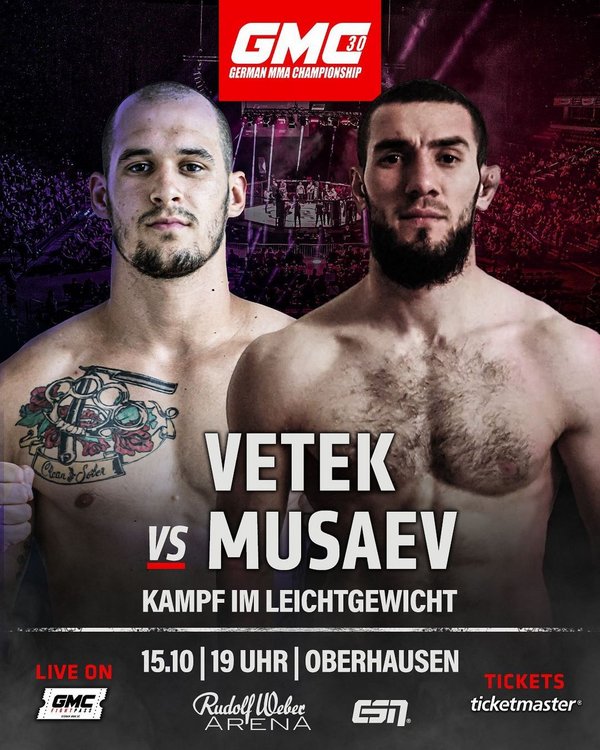 Sein Gegner, der GMC Fight House-Veteran Musaev, bestreitet seinen inzwischen vierten Kampf bei GMC. Am 17. September war er siegreich gegen Amir Safi bei GMC 29. Der schlagstarke Tschetschene, der für den Fußballverein FSV Viktoria Hof spielte, überzeugte sowohl im Stand, als auch auf dem Boden und zeigte sich sehr routiniert im Käfig. Jetzt soll der 4. Karrieresieg her und das nur vier Wochen nach dem letzten Auftritt.