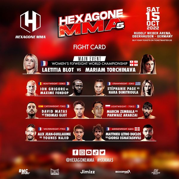 Im Hauptkampf von Hexagone MMA 5 steht der Titel im Fliegengewicht auf dem Spiel. Im auf fünf Runden angesetzten Titelkampf stehen sich zwei unbesiegte Frauen gegenüber. Mariam Torchinava (3-0) aus Georgien will sich das Gold sichern, wenn sie auf die Französin Laetitia Blot (3-0-1) trifft. Die beiden begabten Kämpferinnen messen sich in der Begegnung bis 56,7 Kilogramm, die potentiell über 25 Minuten Kampfzeit geführt werden kann.