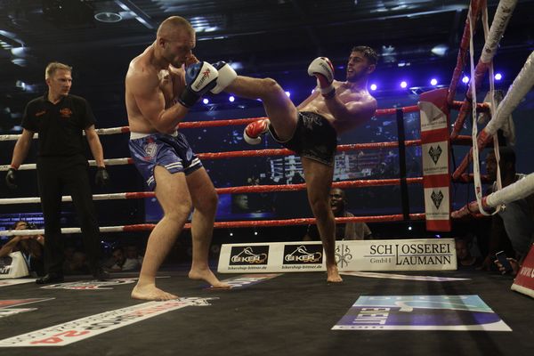 Wesentlich deutlicher sollte der Muay Thai Kampf von Andy Rögner enden, welcher auf Yevgenij Shevchenko aus dem Team Kyshenko traf. Rögner übernahm sofort das Kommando im Ring und ließ dem Ukrainer keine Möglichkeit zur Entfaltung. Egal was Shevchenko versuchte, Rögner hatte immer eine Antwort parat. Daran schien der Schützling von Kyshenko auch mit zunehmender Kampfdauer immer mehr zu verzweifeln und konnte dabei nur noch das Ringseil umklammern. Da dies nicht Regelkonform war, gab es folgerichtig auch einen Punktabzug dafür plus einen weiteren, weil er den Frankfurter im Schwitzkasten hatte. Am deutlichen und verdienten Punktsieg von Rögner gab es nichts zu rütteln.