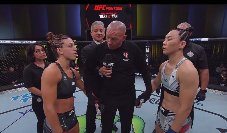 Eine Runde später wurde Dern hart angeklingelt von einem linken Haken, den Yan wuchtig losfeuerte. Im weiteren Verlauf verteidigte die Chinesin Takedown-Ansätze von Dern, konnte im Stand Treffer anbringen, bis es in der letzten Runde wieder eng wurde. Dort hatte Dern einen Hüftwurf durchgebracht und übernahm am Boden die Kontrolle.